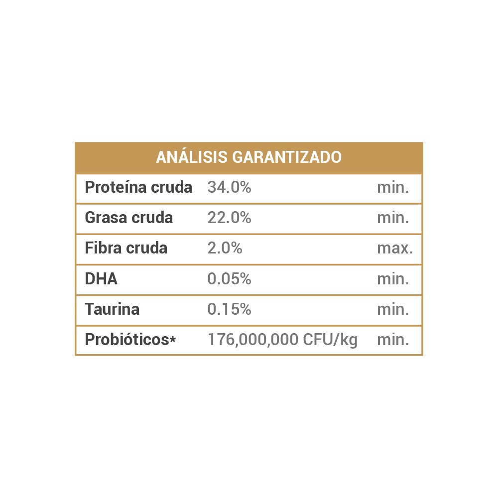 Pollo, harina de pollo, arroz blanco, harina de gluten de maíz, grasa de pollo (conservada con mezcla de tocoferoles surtido), harina de avena, harina de pescado del océano, salmón, papas, celulosa en polvo, linaza, sabor natural de pollo, aceite de salmón (fuente de DHA), raíz de achicoria, alga marina, zanahorias, chicharos, manzanas, tomates, mora azul, espinaca, leche desnatada en polvo, polvo de arándano, extracto de romero, perejil, extracto de yuca, taurina, vitaminas y minerales.