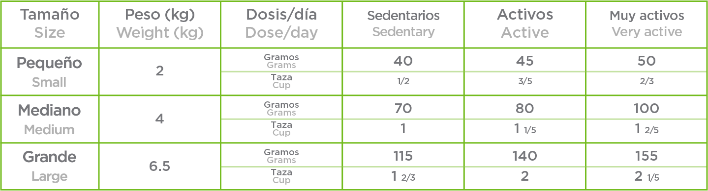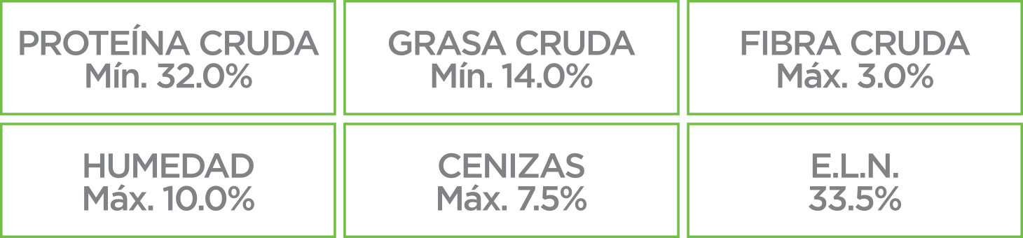 Harina de carne de pollo, arroz cervecero, grasa de pollo, maíz, pulpa de remolacha, harina de pescado, aceite de pescado, sabor natural de pollo, extracto de raíz de achicoria, fructooligosacáridos, cloruro de sodio, cloruro de potasio, cloruro de colina, betaglucanos y mananooligosacaridos (derivado de la pared celular de saccharomyces cerevisiae activa 1×10 10 UFC/g), taurina, acetato de retinol (fuente de vitamina A), colecalciferol (fuente de vitamina D), acetato de DL-α-tocoferol (fuente de vitamina E), menadiona nicotinamida bisulfato (fuente de vitamina K), ácido ascórbico (fuente de vitamina C), mononitrato de tiamina (fuente de vitamina B1), riboflavina (fuente de vitamina B2), ácido nicotínico (fuente de vitamina B3), clorhidrato de piridoxina (fuente de vitamina B6), cianocobalamina (fuente de vitamina B12), D-biotina (fuente de vitamina H), D-pantotenato de calcio (fuente de vitamina B5), ácido fólico, oligoelementos (proteinato de zinc, proteinato de manganeso, proteinato de cobre, EDDI, glicinato de hierro, selenito de sodio), extracto de Yucca schidigera, mezcla de tocoferoles y extracto de romero como conservadores.