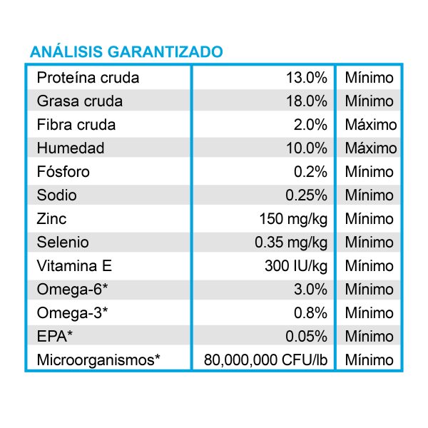 Arroz integral, grasa de pollo (preservada con tocoferoles mixtos), producto de huevo (gallina), proteína de papa, orujo de tomate, linaza, sabor natural (pollo), aceite de pescado menhaden (fuente de epa, preservada con tocoferoles mixtos), carbonato de calcio, citrato de potasio, dl-metionina, cloruro de colina, taurina, raíz de achicoria seca, producto de fermentación de lactobacillus plantarum secos, producto de fermentación de bacillus subtilis secos, producto de fermentación de lactobacillus acidophilus secos, producto de fermentación de enterococcus faecium secos, producto de fermentación de bifidobacterium animalis secos, suplemento de vitamina E, proteinato de hierro, proteinato de zinc, proteinato de cobre, sulfato ferroso, sulfato de zinc, sulfato de cobre, yoduro de potasio, mononitrato de tiamina (vitamina B1), proteinato de manganeso, óxido de magnesio, ácido ascórbico, suplemento de vitamina A, biotina, niacina, pantotenato de calcio, sulfato de manganeso, selenito de sodio, clorhidrato de piridoxina (vitamina B6), suplemento de vitamina B12, riboflavina (vitamina B2), suplemento de vitamina D3, ácido fólico.