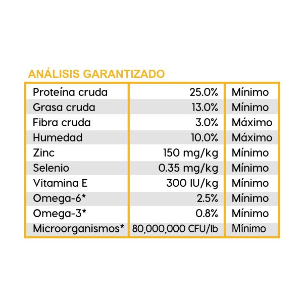 Papas, producto de huevo (gallina), proteína de papa, orujo de tomate, grasa de pollo (preservada con tocoferoles mixtos), linaza, sabor natural (pollo), aceite de pescado menhaden, fosfato dicalcio, carbonato de calcio, cascara de semilla de psyllum, jengibre, raíz de achicoria seca, cloruro de colina, taurina, producto de fermentación de lactobacillus plantarum secos, producto de fermentación de bacillus subtilis secos, producto de fermentación de lactobacillus acidophilus secos, producto de fermentación de enterococcus faecium secos, producto de fermentación de bifidobacterium animalis secos, suplemento de vitamina E, proteinato de hierro, proteinato de zinc, proteinato de cobre, sulfato ferroso, sulfato de zinc, sulfato de manganeso, sulfato de cobre, yoduro de potasio, mononitrato de tiamina, proteinato de manganeso, ácido ascórbico, suplemento de vitamina A, biotina, niacina, pantotenato de calcio, selenito de sodio, clorhidrato de piridoxina, suplemento de vitamina B12, riboflavina, suplemento de vitamina D3, ácido fólico.
