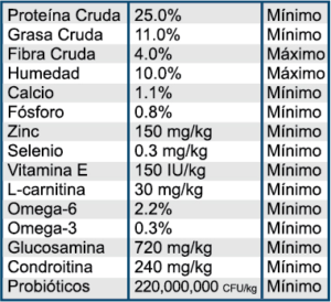 Arroz integral, pollo, harina de pollo, huevo, harina de avena, salvado de arroz, pulpa de remolacha deshidratada, grasa de pollo (preservada con mezcla de tocoferoles), saborizante natural, linaza, harina de pescado, cloruro de potasio, cloruro de colina, hidrocloruro de glucosamina, raíz de achicoria deshidratada, L-Carnitina, extracto de yuca schidigera, chícharos, col rizada, chía, calabaza, arándanos, naranja, quinoa, alga marina, coco, espinacas, zanahoria, papaya, Lactobacillus acidophilus, Bifidobacterium lactis, Lactobacillus reuteri, vitaminas, minerales, minerales quelados, ácido fólico.
