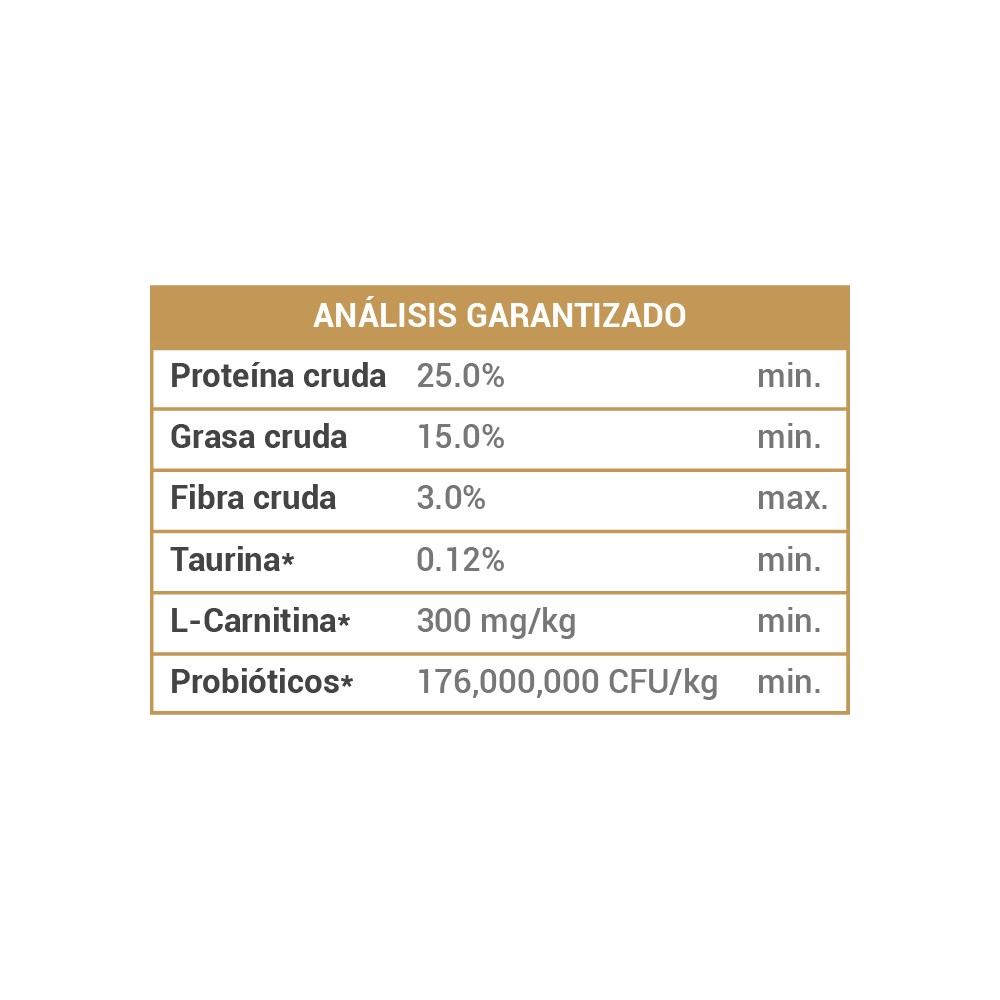 Cordero, harina de cordero, cebada quebrada, arroz moreno integral, producto de huevo, grasa de pollo (preservada con mezcla de tocoferoles), mijo, pulpa de remolacha, papas, linaza, sabor natural, harina de pescado, cloruro de potásio, sal, cloruro de colina, raíz seca de achicoria,Lcarnitina, extracto de yuca, vitaminas, minerales y minerales quelados.